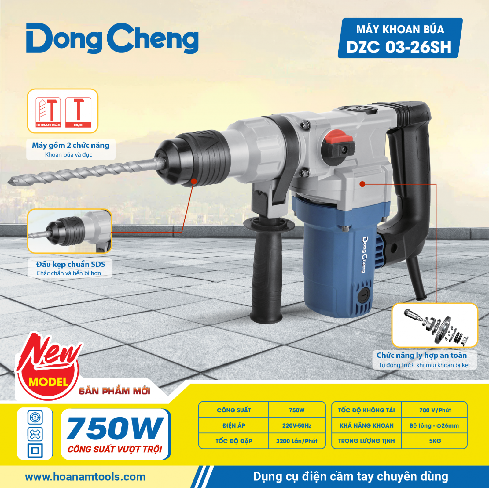 - Công suất mạnh mẽ 750W: Với công suất 750W, máy khoan búa DZC03-26SH đảm bảo vận hành trơn tru, mạnh mẽ, giúp bạn khoan, đục các bề mặt cứng như bê tông, đá, gạch một cách dễ dàng và nhanh chóng.