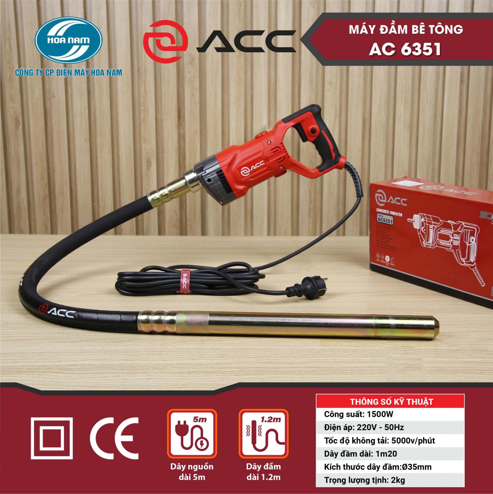 Máy đầm dây AC6351 của thương hiệu ACC là thiết bị không thể thiếu trong thi công bê tông, giúp loại bỏ bọt khí, tăng độ kết dính và đảm bảo chất lượng bề mặt. Với công suất 1500W, tốc độ rung 5000 vòng/phút, cùng thiết kế nhỏ gọn, linh hoạt, sản phẩm giúp rút ngắn thời gian làm việc và nâng cao hiệu quả thi công.
