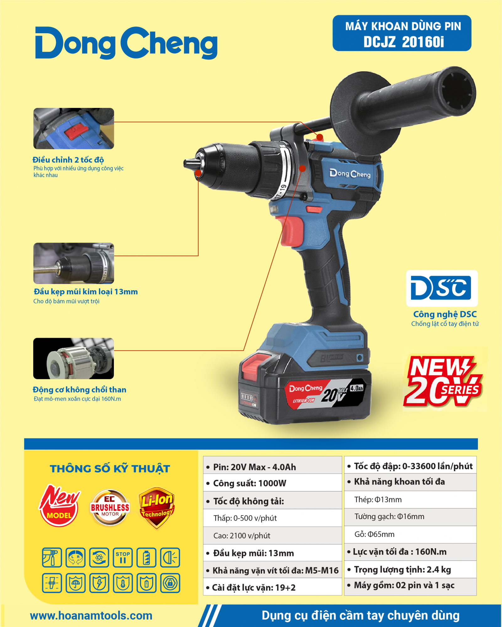 1. Đặc điểm nổi bật của máy khoan dùng pin DCJZ 20160i